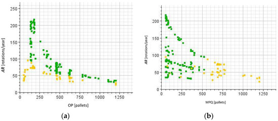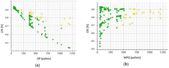 With respect to the strategic KPIs, Figure 3a shows that the highest (>200 rotations/year) is obtained with OP ≈ 150–200 pallets. Solutions with OP < 100 pallets are almost all unfeasible. In general, it is reasonable to expect that the increase in OP involves a corresponding increase in the number of . This, in turn, increases the cycle time of assets, worsening the . This is confirmed by the negative correlation between these variables (−0.66). The relationship between and MPQ (Figure 3b) is very similar (−0.49). When the MPQ is higher, Company A will reduce the recovery operations and will probably increase the number of orders, resulting in a higher and thus decreasing the usage of each asset.