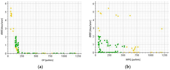 The relationship between and OP is evident from Figure 4a and quite easy to explain. Higher OP generates higher inventory available when orders are placed and therefore, out-of-stock situations are less likely to occur. Accordingly, these variables exhibit a negative correlation (−0.59). From Figure 4a it can also be seen that configurations with OP > 250 pallets always generate null (or almost null) , which is an important evidence for Company A. Conversely, with values of OP from 100 to 200 pallets situations are particularly likely to occur, although the resulting configurations are unfeasible. The relationship between and MPQ is slightly less evident (Figure 4b). In general, lower MPQ seems to generate higher , probably because higher MPQ involves a higher , thus making situations less likely to occur. Nonetheless, it should also be noted that, in feasible configurations, stock-out situations are very unlikely to occur, as their maximum value is 2 days/year. The low correlation coefficient (−0.14) confirms a weak relationship between these variables.