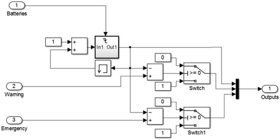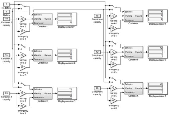 A container subsystem (Figure 2) was deployed in the model, which simulates operation by integrating a battery accumulation mechanism at each container input (we considered a unitary weight of the batteries) and a mechanism for checking the framing in the default thresholds. The outputs of the subsystem are the current container weight and the warning flags when the thresholds are exceeded.