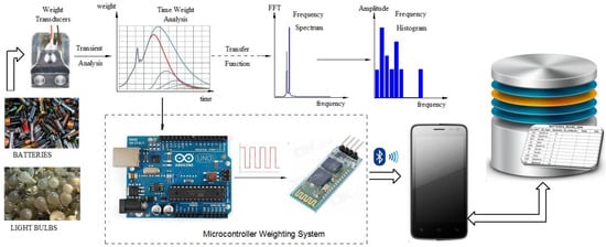 The weighing system for batteries, described in Figure 6, can be examined using basically two methods. The first one focuses on the time domain, which refers to the weighing of batteries collected in a certain period of time, and the second one is a frequency domain, which refers to the number of warning levels reached in a certain time period. The waste battery collection solution involves the use of a microcontroller weighing system based on Arduino. Using Bluetooth communication, weight data is transmitted to a database via a smartphone or tablet. All common Bluetooth modules used with Arduino implement the Bluetooth Serial Port Profile (SPP). Once the devices are paired, the computer or smartphone will see the module as a serial port.