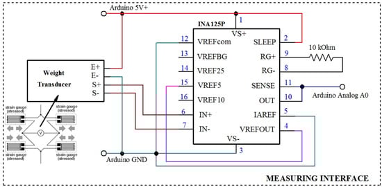 The measuring interface uses a weight transducer in the form of full-bridge configuration, as presented in Figure 7. This type of configuration is more sensitive than other ones such as the half-bridge quarter-bridge circuit, and the most important aspect is that this transducer configuration is linear, so the output voltage is directly proportional to the weight of the batteries.