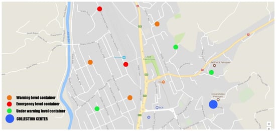 The sensor inside the containers has two threshold settings: a warning level (a minimal threshold) and an emergency level (an alarm threshold). The warning threshold is 75% symbolized with the orange color in Figure 4, and the emergency threshold is 95%, symbolized with the red color in Figure 4. The collection center in Figure 4 is symbolized with the blue color.