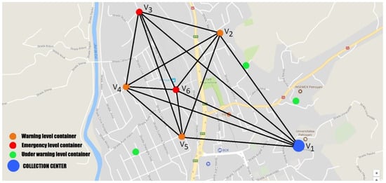 For a city we have one or more battery waste collection centers that have at least one car assigned for waste collection and an “m” amount of local collection points, each one of which with at least one waste collection container equipped with a waste quantity detection sensor that reads and transmits data. For this configuration, we create an associated graph for the map. This is a complete oriented graph with m + 1 nodes, as we include in this graph the collection center as well.