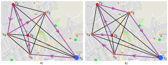 For the first case, we considered the following adjacency matrix with six rows and six columns, with n = 5 containers and one collection center, extracted from the existing nine nodes. The six nodes are as follows: one collection center (Node 1), three warning-level containers (Nodes 2, 4, and 5), and two emergency-level containers (Nodes 3 and 6). The adjacency matrix has fixed values representing distances in kilometers between nodes (from Google Maps).