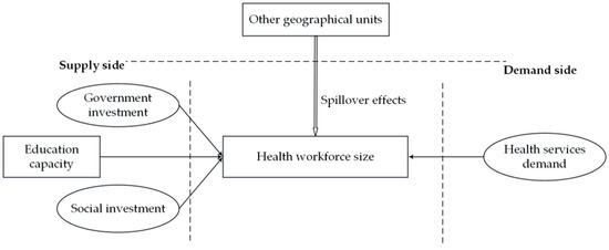 To summarize, the health labor market in one country should be understood as a combination of several geographically-defined health labor submarkets. It is the different dynamics in each submarket and spillovers between the submarkets that result in the unbalanced distribution of a health workforce. Figure 2 shows the “supply–demand–spillover” theoretical model built in this study to understand the dynamics and spillovers of the geographically defined health labor submarkets. Fortunately, the similarity of cultural, political, and economic settings makes it convenient to model the health labor submarkets within countries. The determinants of the health workforce size in one certain area can generally be divided into three parts: demand-side factors, supply-side factors, and spillover effects of other geographical units.