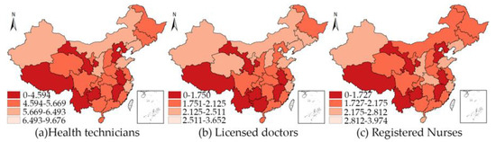 The average density of three categories of the health workforce at the provincial level (2012–2014).