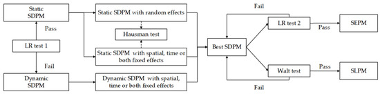 Model specification procedures of the spatial econometric panel models [42]. LR: likelihood ratio; SDPM: spatial Durbin panel model; SEPM: spatial error panel model; SLPM: spatial lag panel model.
