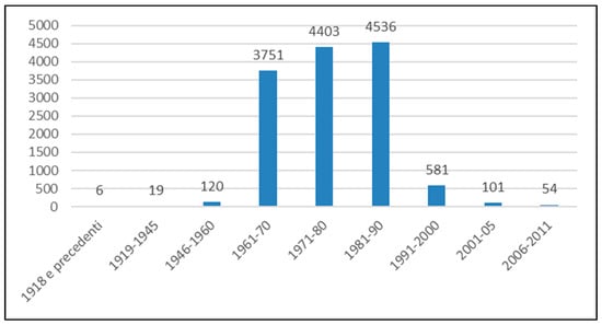 Out of 13,571 buildings, mostly residential, corresponding to 94% of the total buildings, 8,939 buildings were constructed between 1971 and 1990, while 3751 housing units were built between 1961 and 1970 (see