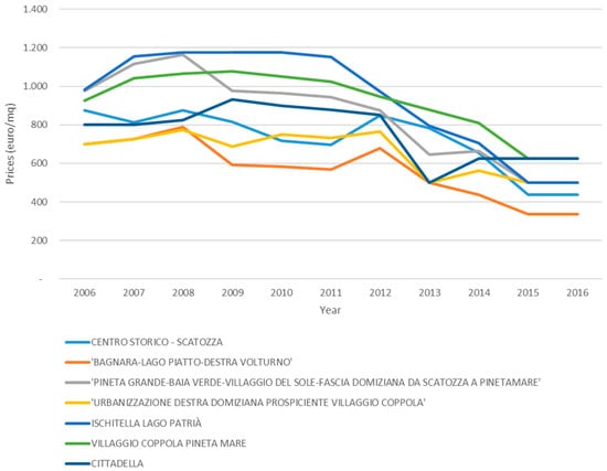 By analysing the residential prices at the local scale, it is worth noting how the trend described is differentiated by areas up to the period 2008–2009, when the areas of “Ischitella—Lago Patrià” and from “Pineta Grande to Pineta Mare” show a better hold about the others. In the two-year period 2012–2013, however, all the areas have a marked contraction of prices with a collapse recorded in the developments to the right of the Domitiana, Bagnara, Lago Piatto, Destra Volturno, and finally the Historic Centre, and Scatozza.