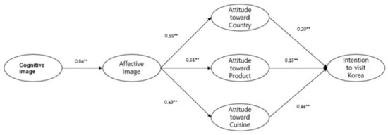 The SEM was conducted by using a maximum likelihood estimation approach. The goodness-of-fit statistics showed an acceptable fit to the data (Normed-χ2 = 2.358, RMR = 0.072, GFI = 0.916, NFI = 0.938, IFI = 0.964, CFI = 0.963, RMSEA = 0.062 [48]. Figure 2 and Table 4 describe the details about the SEM results. All seven hypotheses were statistically supported at p < 0.05 and p < 0.01. More specifically, Hypothesis 1 proposed that cognitive destination image positively affects affective destination image. The result provides support for this hypothesis (β = 0.842, p < 0.01). Hypothesis 2 predicted that affective image positively influences attitude toward a country. The result suggests support for this hypothesis (β = 0.555, p < 0.01). The linkage between affective destination image and attitude toward product was significant (0.511, p < 0.01), supporting Hypothesis 3. Affective destination image positively influences attitude toward cuisine, was (β = 0.433, p < 0.01), so Hypothesis 4 was supported. Attitude toward country positively influences intention to visit Korea (β = 0.205, p < 0.01), thereby supporting Hypothesis 5. Hypothesis 6 predicted that attitude toward products positively influences intention to visit Korea (β = 0.150, p < 0.05). Therefore, Hypothesis 6 was supported. Finally, attitude toward cuisine positively influences intention to visit Korea (β = 0.440, p < 0.01), supporting Hypothesis 7.