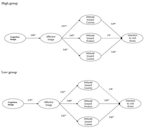Table 5 and Table 6, as well as Figure 3 and Figure 4, indicate the results of the moderating effects of destination familiarity and product familiarity. When we compare the constrained and unconstrained models, performing a chi-square difference (Δchi-square), and examining the differences in degree of freedom (Δdf), the moderating effect of familiarity becomes clear [50]. We tested the path relationships that caused the statistical differences between two models. The coefficients were constrained and compared with the unconstrained model. The differences in the coefficients between constructs were indeed significant. However, the relationship between attitude toward country and intention to visit Korea did not differ significantly for the high and low groups (destination familiarity and product familiarity). Similarly, the link between attitude toward product and intention to visit Korea did not differ significantly for the high and low groups (destination familiarity and product familiarity). Thus, Hypotheses 8a–g and 9a–g were supported except for Hypotheses 8e,f and 9e,f.