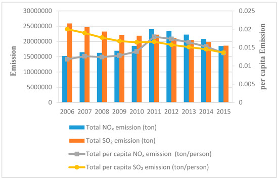 Figure 1 illustrates SO2 emission and its per capita value decreased in China from 2006 to 2015 according to the targets of the 11th and 12th FYPs (The national target of 11th FYP to reduce 10% of SO2 emission was achieved [1]. Also, China surpassed the national targets of the 12th FYP by 18% reduction in SO2 emission [18].) (see [18]). The total NOX emission and its per capita kept rising in the period of the 11th FYP but went down in the period 12th FYP (In 2015, China fulfilled the national targets of the 12th FYP by 18.6% reduction in NOX emission [18].) (Figure 1).