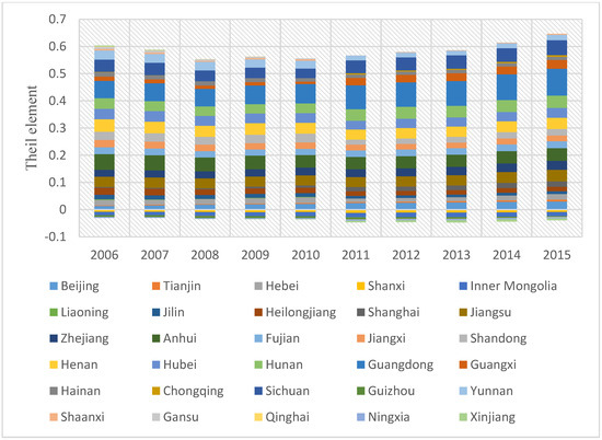 Provincial contribution of per capita NOX emission inequality (Theil element) using the Theil index (2006–2015). Source: Authors using NBS data.