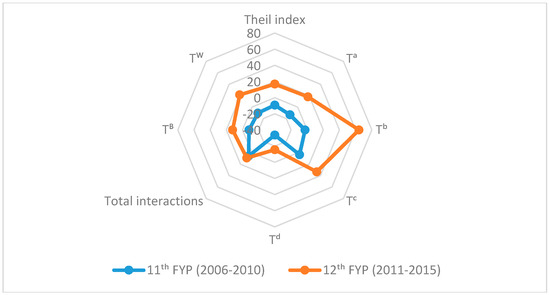 Figure 8 shows the percentage value of increase or decrease the national and regional inequality with the aim of comparing the 11th and 12th FYPs. The biggest increase in the level of different inequalities took place during the period of the 12th FYP. 64% increase in coal intensity of power generation () during the period of the 12th FYP must be related to the particular attention given to coal combustion, such as prohibiting the construction of new coal-fired power plants and mandating the use of cleaner energy in the power sector. Those policies covered just the key regions (China promulgated its Plan to Control Air Pollution in the key regions including the Beijing–Tianjin–Hebei, Yangtze River Delta, and Pearl River Delta regions, as well as the city clusters of Central Liaoning, Shandong Province, Wuhan region, Changsha–Zhuzhou–Xiangtan, Chengdu–Chongqing, Straits Fujian, Central and Northern Shanxi, Shaanxi–Guanzhong, Gansu–Ningxia, and Urumqi in Xinjiang [1]. These clusters are located mostly in the eastern and western China areas.) which account for 52% of the national coal consumption [1]. However, some of the remaining areas, especially in the central region such as Henan, Jilin, and Heilongjiang, have more intensive coal consumption by power generation than the national average level, yet they were excluded from the plan. The exclusion has increased the within-region inequality ) in the central region. Meanwhile, the importance of power intensity of GDP () has grown in this period.