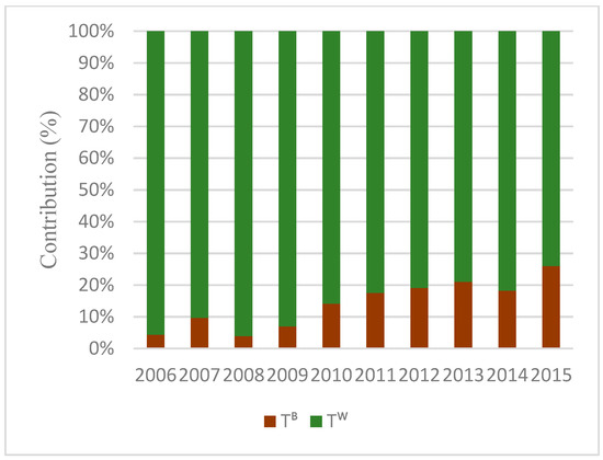 Figure 11 shows the great difference in within- and between-region inequality (). The difference implies a disparity in regional planning and this illustrates the importance of decomposition analysis. The contribution of the western region into between-region inequality () is significant in all years (see Figure 11). But for within-region inequality, the increased proportion of the NOX emission intensity of gasoline consumption () is significant in within-region inequality () (see Figure 12). The western and eastern regions are more responsible for increasing the within-region inequality (), and interestingly, it decreased after 2014 (see Figure A3). Also, the between-region inequality is rising due to the rise of inequality in NOX emission intensity of gasoline consumption () across regions (see Figure 13). This is strongly linked to the 230% growth rate of the share of the eastern region from 2006 to 2015 in total between-region inequality (see Figure A4). This dramatic growth is mostly attributed to the improvement of the quality of gasoline and technology in the eastern provinces.