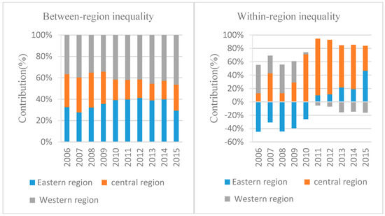 Most of the eastern provinces such as Guangdong, Beijing, Shanghai, Jiangsu, Zhejiang, Hebei, and Tianjin experienced positive growth of the Theil element, which means they contributed more to raising China’s inequality from 2006 to 2015. This trend reflects the success of local treatments to control SO2 emission under 11th and 12th FYPs in these provinces. According to the 12th FYP on air pollution prevention and control [1], coal-fired power plants have to install desulfurization equipment, which can bring SO2 emission reduction efficiency of about 90% in key regions. Inner Mongolia has the greatest negative magnitude (−6.3%) to reduce the total inequality, which indicates the worst air quality. Guizhou, Qinghai, and Xinjiang have the total lowest shares, following Inner Mongolia, and the negative influence of the western region in China inequality is significant. Figure 5 shows within-region inequality () is quite similar to that between-region () for all years. The contributions of the eastern region in between-region inequality () and the western region in within-region inequality () are remarkable for the whole period (see Figure 5). With regard to the increase of between-region inequality (), the power intensity of GDP () contributed to its growth from 2010 onward (see Figure 6). This finding is related to the positive element of the eastern region for the power intensity which shows power production is only a minor share of GDP compared to the national average (see Figure A1). However, regarding within-region inequality, the coal intensity of power generation (), and power intensity of GDP () are all responsible for inequality growth after 2011 (see Figure 7), and the primary cause was the western region (see Figure A2).