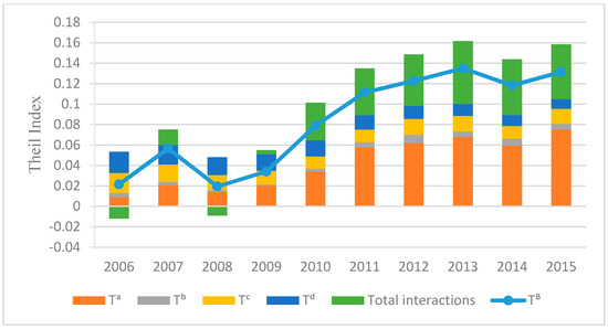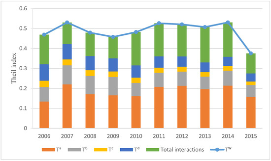 Figure 3 shows China’s SO2 emission inequality (Theil index) and represents an increase of 6% in overall inequality from 2006 to 2015. In spite of achieving the targets of the 11th and 12th FYPs to reduce the SO2 emission [18], the Theil index reveals a slightly increasing trajectory of between-province inequality during this period. During the period of the 11th FYP, 9.2% decline in total inequality occurred but during the period of the 12th FYP, it increased by about 17%. The main reason for this growth after 2010 is related to the power intensity of GDP ().
