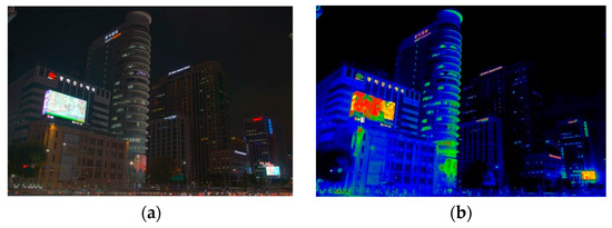 Digital image processing for the determination of light pollution: (a) Actual image of a billboard sign; (b) Analysis image using light measuring camera (LMK) lab soft.