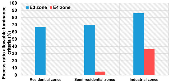 In the target areas investigated for light pollution caused by space lighting 67%, 70%, and 86% of the street and security lighting exceeded the recommended vertical luminance values in residential, semi-residential, and industrial areas located in E3, respectively. Similarly, 5% and 36% of space lighting in semi-residential and industrial areas, respectively, located in E4 exceeded the vertical luminance values dictated by the law. Figure 3 shows the ratio of areas with space lighting exceeding the recommended lighting limits.