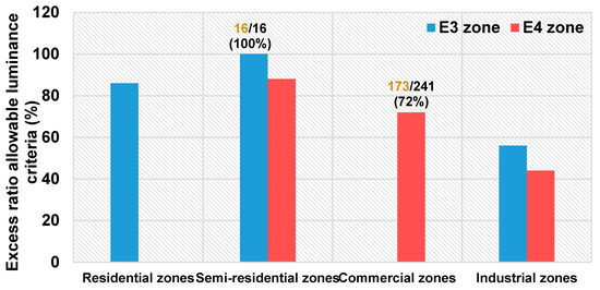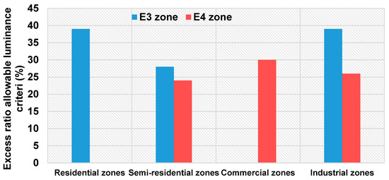 Regarding the number of decorative lights with surface luminance exceeding the allowed values in the investigated areas, 86%, 100%, and 56% of the decorative spaces in residential, semi-residential, and industrial areas, respectively, in E3 had higher luminance values than those dictated by the law. Correspondingly, 88% of semi-residential areas, 72% of commercial areas, and 44% of industrial areas located within E4 exceeded the lighting limits allowed. Figure 5 shows the ratio of areas with decorative lighting exceeding the recommended lighting limits.
