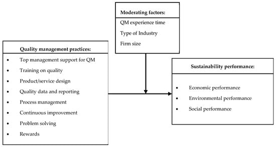 Profitability is still the priority of most organizations. To increase financial benefits, many organizations sacrificed the environment aspects. Awareness of “sustainable development” motivated them to effectively balance among the three aspects—finance, environment, and society. To do so, enterprises should implement “sustainability management”, which is defined as “accelerating the adoption of best management principles, models, and practices throughout the operations system, and enabling the environment to achieve sustainable development” [3]. Quality management (QM), besides the ultimate goal to provide superior values to customers by continuously improving process efficiency, is also recognized to share similar purposes and common implementation factors with environmental management system [4]. Quality management, in this sense, would be a feasible approach contributing to sustainability performance (SP). Along with this, the question on how the implementation of quality management practices would affect sustainability performance, therefore, is of great importance not only to practitioners, but also to policy makers and academic researchers.