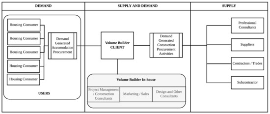 Warren-Myers and Heywood’s [4] examination of literature and analysis of the housing sector through analytical experience, theorized that industrialized residential construction realigned the traditional perspectives on demand and supply actors. Their framework for demand and supply actors and relationships as they exist in the Australian volume residential construction sector is based upon a consumption-based demand and supply model [18] interpreted through the D&C procurement approach (Figure 1).