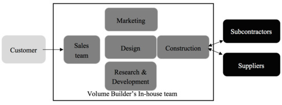 Current supply-led D&C theory assumes or treats each home purchase as a unique event with individual supply chains for creating the product. The practice of industrialized D&C may not accurately reflect that theory. Australian Volume Builder’s current practice of dwelling construction is shown in Figure 4. There is variance between the industrialized D&C that comprises the approach displayed in the volume housing sector and the theoretical approach of D&C (changes discussed in [9,15]), as the element of multiple purchasers and the Volume Builder acting as an intermediary in the contracting process changes the dynamics in the relationships between the stakeholders. As previously discussed, (Figure 2 and Figure 3) current practice makes Volume Builders suppliers of housing products procured by consumers. However, exploration of Volume Builders’ relationships and interactions with other actors suggest that the supply and demand relationships are otherwise.