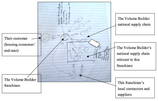 Warren-Myers and Heywood [4] theorized the central role of the Volume Builder in the industrialized Design and Construct approach that is evident in Australian new residential construction. The evidence here showed the dominance of Volume Builders regarding both the traditional demand-side actor, the customer (consumer), and the supply-side actors of the supply chain. A selection of diagrams drawn by the different respondents (Figure 5, Figure 6 and Figure 7) highlights their centralized role in the process. An example from each of the different builder types are included to demonstrate that although the product type varies, fundamentally their relationship with customers/consumers and supply-side actors are similar, and they see themselves as a central conduit between the customer and the supply side.