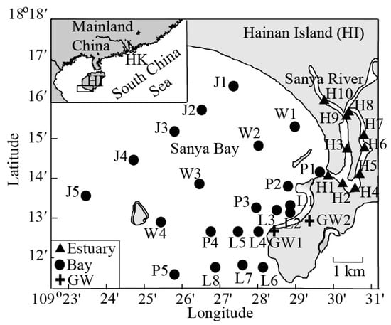 Sanya Bay has an average water depth of 16 m [19] and irregular diurnal tides with a mean tidal range of 0.9 m [23]. The annual mean surface water temperature is 26.8 °C and the annual precipitation is around 1600–1800 mm [23]. The Sanya River discharges into Sanya Bay in the northeast with an annual average discharge of 5.86 m3 s−1 [24]. 90% of the rainfall occurs in May to October, and the river discharge in June to November accounts for 85% of the annual discharge [25]. Fringing reefs develop along the east coast and around the islands in the bay. Sanya Bay is oligotrophic under the influence of the northern South China Sea [26]. Multiple habitats, coral reefs, mangroves, mudflats, and rocky and sandy beaches, are present in the bay [19]. Holocene deposits of coral debris, sand, and silt surround the coast [27]. The sediments in the bay are mostly sands (>60%) [28], composing a highly permeable surface quifer.
