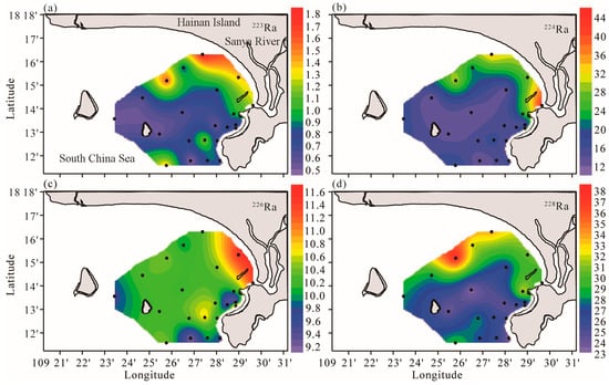 Surface distributions of radium isotopes (in dpm100 L−1) in Sanya Bay in February 2012, (a) 223Ra; (b) 224Ra; (c) 226Ra; and (d) 228Ra.