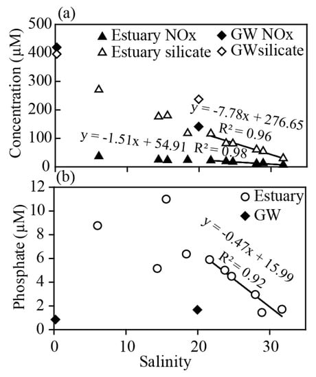 Concentrations of nutrients against salinity in the Sanya River estuary and groundwater (GW), (a) oxidized inorganic nitrogen (NOx) and silicate (b) phosphate.