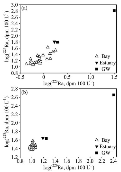 where is the ratio of the flux of 224Ra over that of 228Ra into the system, equivalent to the activity ratio of 224Ra to 228Ra of the flux into the system, λ224 is the decay constant of 224Ra, and is the ratio of the inventory of 224Ra over that of 228Ra in the system, which is equal to the activity ratio of 224Ra to 228Ra in the system. In estimating the apparent water age, 224Ra works well in time scale of a few days and 223Ra works well in longer time scale up to tens of days [16,17,18]. Due to the relatively short residence time in the bay, 2.85–7.89 days [24], 224Ra, but not 223Ra, was used in the age model in this study.