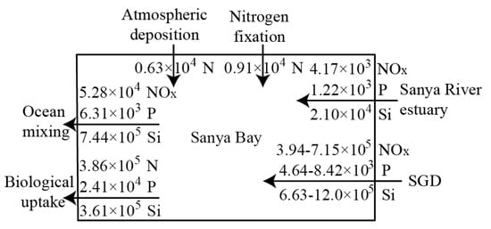 In the nutrient budget of Sanya Bay (Figure 6), the source terms include the Sanya River estuarine export, SGD, atmospheric deposition, and nitrogen fixation. The sink terms are ocean mixing and biological uptake. The biological uptake of nutrients is directly related to carbon uptake, i.e., conversion of inorganic carbon to organic carbon. On the other hand remineralization of organic matter releases inorganic carbon and nutrients. In this sense nutrient cycles are intertwined with the carbon cycle. The total sink is 4.39 × 105 mol d−1 nitrogen, 3.04 × 104 mol d−1 phosphorus, and 1.11 × 106 mol d−1 silicate, while the total source is 4.13–7.34 × 105 mol d−1 nitrogen, 5.86–9.64 × 103 mol d−1 phosphorus, and 6.84–12.2 × 105 mol d−1 silicate. According to our data, the source and sink terms of nitrogen and silicate can be balanced in Sanya Bay. A deficit in phosphate is present. At least 2.08 × 104 mol d−1 phosphorus is required to fill the gap. We propose two reasons for this deficit: (a) benthic flora of about 150 species were found in Sanya Bay [49] and macroalgae usually demonstrate an N:P ratio of about 30 in their tissues [50]; if this ratio were considered in estimating the biological uptake rate of phosphate based on the nitrogen uptake rate, a much lower biological uptake rate of phosphate would have been obtained to decrease the deficit; and (b) benthic release of phosphorus due to remineralization or grazing of organic matter may be a phosphate source.