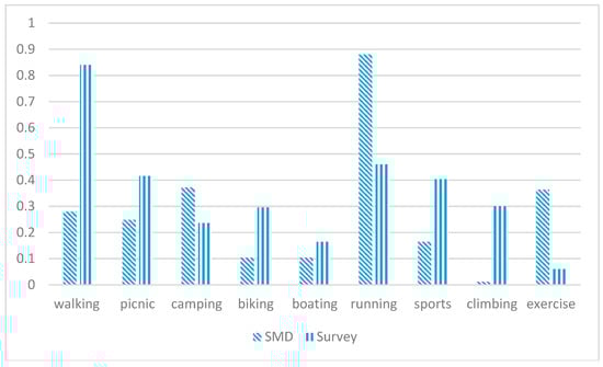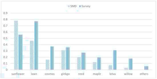 First, SMD is selective data associated with the social media users’ emotions and pride. The massive volume of sampling size of SMD does not change the fact of this data source’s selective generation mechanism. Social media users prefer to input information that is more likely to be read by friends and web viewers. Hence, SMD partially reflects the essence of the phenomenon it records and should never be deemed as a perfect data source. In this study, the fact that that sunflowers were reported with higher attractiveness than lawn from SMD suggests that people might like to share more exciting scenery. Though lawns are suggested as of higher attractiveness from survey data, these “normal” scenes may not stimulate the social media users to mention them in their posts. For the same reason, the activity of running, extracted from SMD, is evaluated as a more attractive factor; while the survey data suggests that walking is a more attractive activity in the park. In this selective process, the true fact of attractiveness is represented by the excitement of particular programs.