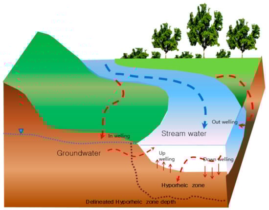 Hyporheic zones are zones in which groundwater and surface water actively lead to a unique hydraulic phenomenon owing to many factors such as geographic and river conditions []. They also react sensitively to climate change, acting as an important indicator in water environment studies. In particular, this zone has attracted attention from researchers in many different fields (hydrologists, hydrogeologists, geochemists, ecologists, and microbiologists) owing to its hydraulic uniqueness.