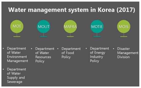 As of 2017, the Government of South Korea consists of 17 ministries. Among them, the water environment is managed by five ministries: the Ministry of Environment (MOE), the Ministry of Land, Infrastructure and Transport (MOLIT), the Ministry of Agriculture, Food and Rural Affairs (MAFRA), the Ministry of Trade, Industry and Energy (MOTIE), and the Ministry of the Interior and Safety (MOIS) (Figure 2). In particular, the water quantity, quality, and environment related to natural disasters (e.g., typhoons, floods, heavy rain, storms, tsunamis, heavy snow, drought, and earthquakes) are managed. In South Korea, the Ministry of Environment is a central administrative agency in charge of tasks related to the natural environment, the conservation of the living environment, and the prevention of environmental pollution. The total budget for the Ministry of Environment in 2015 was US 52 billion, of which US 23 billion was allocated for water quality improvement projects and response to the frequent localized torrential downpours due to climate change []. The Ministry of Land, Infrastructure and Transport (hereafter referred to as the Ministry of Land) is a central administrative agency that supervises the affairs related to the establishment and coordination of the comprehensive national land plan, the conservation, utilization, and development of land and water resources, the construction of cities, roads, and housing, and the tasks related to coasts, rivers, reclamation, land transportation, railroads, and aviation. The total budget for the Ministry of Land in 2015 was US 21 billion, of which US 2 billion was allocated for water resource management, such as river management and conservation and management of groundwater []. The budget for water environment projects accounted for 1.2% of the total budget of the South Korean government in 2015. The Ministry of Environment’s budget for water-resource-related projects was slightly higher than that of the Ministry of Land for 2015. However, most of the Ministry of Environment’s budget is allocated to the water supply and the sewage system. Focusing on the water-resources-related project budget, the Ministry of Environment is attempting to maximize the organization, budget, and manpower through water environment projects, which is 43% of the total budget, as it competes with the jurisdiction budget. Even though the Ministry of Land allocates approximately 10% of its total budget to water environment projects, it is limited in securing hegemony and maintaining jurisdiction in the water environment business.