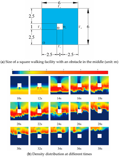 t = 20 s), because pedestrians always choose the shortest route, which means they go straight continuously after passing the obstacle. A triangular region is formed behind the obstacle where normal walking pedestrians cannot arrive, until the twelfth phase that all pedestrians pass this region. Meanwhile, a part of density remains high for the congestion is not dissipated. At the end, the rest of pedestrians leave the facility in order. As can be seen in those results, the pedestrian movement pattern is mainly as same as the empirical rules we observe. In addition, we can apply those equations and numerical analysis methods to the experiment scenario below.