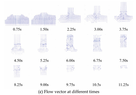 The trend and direction of pedestrian movement can be found via a flow vector plot. At the beginning of the simulation, the pedestrians flow into the narrow channel and becomes congested at bottleneck. The flow in the middle part is larger, which leads to the arch form increasingly dissipating. When the pedestrians encounter the bottleneck, there is an arch jam lasting for 4–5 s.