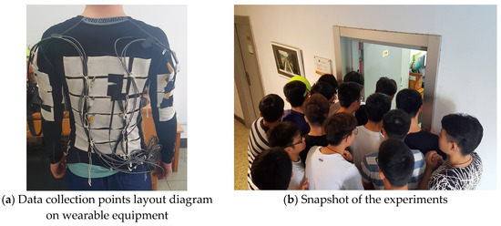 First, we needed to ensure that the experimental scenario was the same as in the simulation. The test area was set at a 1 m-wide door with a 2 m-long channel inside. All the participants waited outside. At the beginning of the test, the testers wear the equipment and were arranged in the congested area in accordance with the same conditions of congestion and squeezing into the door. The crowd started with an initial density of 5.6 ped/m