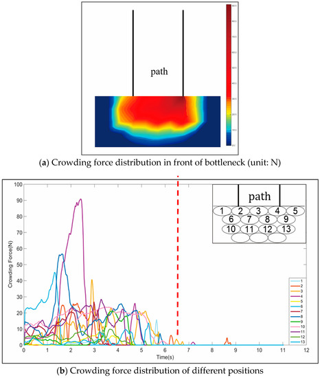 After 45 repeated tests, a large amount of data was obtained. The difference in the time required for whole test between simulation and experiment was within acceptable limits. The simulation result and experimental result were 11.85 s and 12 s, respectively. The error was 1.3%. By extracting the maximum crowding force at each position, which refer to the most dangerous situation could happen at bottleneck,