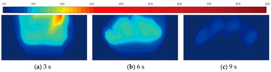 Figure 6 shows the maximum crowding force at each position’s distributions in three phases. At the third second, the person who is closest to the bottleneck is bearing a force of 40 N. At that point, the crowd has reached congestion. At the sixth second, the crowded area begins to collapse slowly. Pedestrians enter the narrow channel more or less and the interactional force is obviously reduced. The crowding force of the group that does not walk into the channel remains at 15 N, which implies that the interaction still exists among pedestrians. At the ninth second, the arched area completely disappeared, and the crowding force decreased to below 5 N. Most of individuals no longer bore pressure, because increasingly more people passed the bottleneck. As we have mentioned above, the empirical maximum contact force a normal adult can bear is 247 N [
