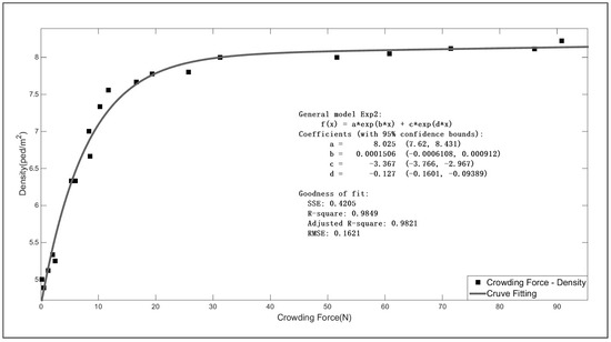 In order to discover the behavior of pedestrians’ movement more intensively and how the density and force impact the cluster risk, we extracted the density of the bottleneck simulation and the crowding force of the experiment above in the same scenario to investigate the relationship of this two parameters. We also calculated the crowd densities at different times by analyzing the pedestrian movement recorded by video, comparing with the results we get from macroscopic model to assure the consistency of simulation and experiment. In combination with the pressure test results, the corresponding function between force and density was established. The data were drawn at a 0.5 s interval; the fitting curve is shown in