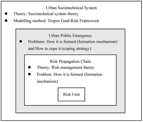 To sum up, risk is accumulated, transmitted and transformed into emergency in the urban sociotechnical system, threatening urban security and development. This paper aims to first build a model of the urban sociotechnical system, and extract the risk propagation chain embedded in it. In this process, Tropos Goal-Risk framework is introduced into the model, based on the concepts, characteristics, and components of the sociotechnical system and risk propagation chain. Then the paper explores the risk propagation chain mechanism of emergencies in the sociotechnical system, so as to propose targeted countermeasures to curtail risk propagation process and promote sustainable development of cities.