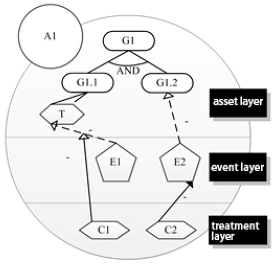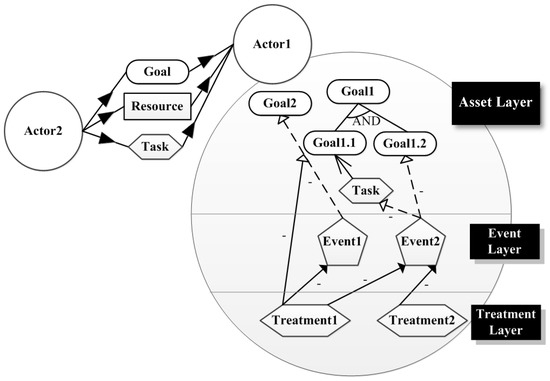 Tropos Goal-Risk framework, shown as Figure 3, provides a conceptual model and technical support for risk identification, description, assessment, and control. This framework is composed of three layers, namely asset layer, event layer and treatment layer. In the asset layer, the various stakeholders in the environment and their intentions are identified, and the relationships among these elements are analyzed. The event layer is used to identify the uncertain factors’ impacts on the asset layer. In the treatment layer, countermeasures are put forward to mitigate risks.