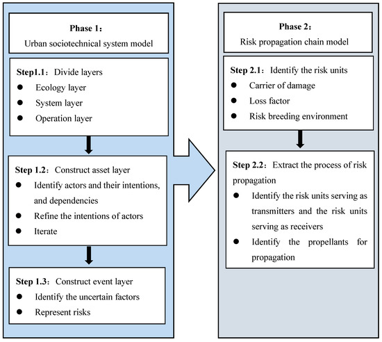The actors cooperating with each other form the network chain structure to support the operation of the sociotechnical system. It is obvious that risks can be transmitted in the system due to the dependencies. The risk propagation is multidimensional and also includes human, technical and socio-economic factors and so on [51]. By constructing the risk propagation model in sociotechnical system, the multidimensional factors can be taken into account. Accordingly, constructing an urban public emergency risk propagation chain model means identifying the risk units inside actors and extracting the process of risk propagation based on the urban sociotechnical system, as shown in Phase 2 of Figure 4.