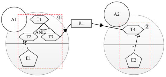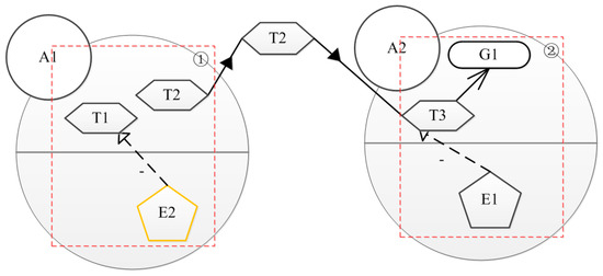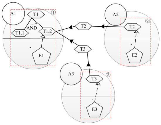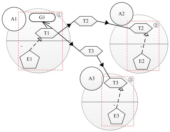 Risk propagation from many to one means that the risk consequences and/or the loss factors are transmitted from multiple risk units to one. As shown in Figure 9, the task T1 of the actor A1 is decomposed into T2 and T3, which are delegated to the actors A2 and A3 to execute, respectively, and the risk consequences and/or the loss factors carried by T2 and T3 converges and overlaps in the risk unit ① via the dependency relationships.