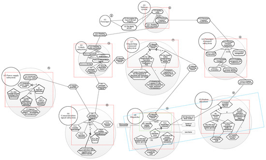 In Figure 13, the internal regions of the dispatcher, station attendant, and power supply subsystem marked by the red dashed rectangles generated risks in this accident, constituting the risky risk units. The internal regions of other actors marked by the red dashed rectangles did not generate risk before the risk propagation in this accident, constituting the healthy risk units. On the limit of space, the various elements of the healthy risk units are not shown in Figure 13.