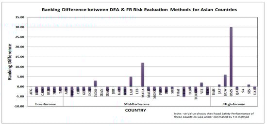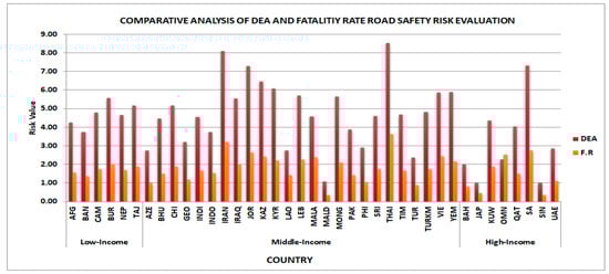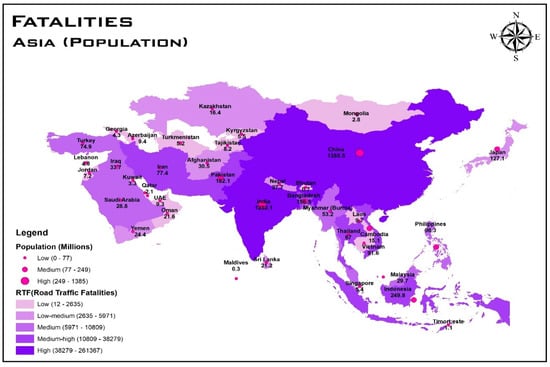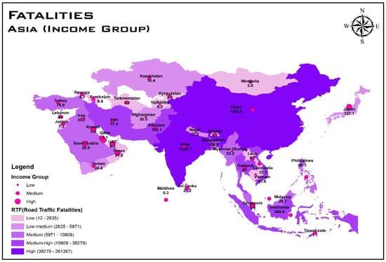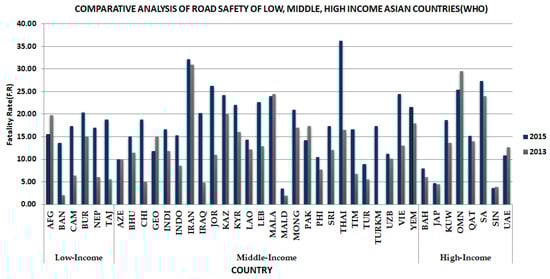 Economic development, on one side, has increased motorization all over the world, particularly in low- and middle-income countries []. The increased number of motor vehicles requires more roads and higher demand for better measures of road safety and protection. In the year of 2014, the number of motor vehicles increased by 16% all around the globe; however, it is important to note that the road network has not been developed at the same rate [,]. Considering the fatality rate (deaths in road crashes per 100,000 of population) as a road safety indicator, that of the Southeast Asian Region (17) is still higher than that of Europe (9.3) []. This alarming situation highlights the need for promoting risk prevention actions across nations. As mentioned above, the traffic accident and injury statistics depict the worst position of the low- and middle-income regions, where the fatality rate is almost twice that of developed countries []. In the Asian region, the road safety situations of low-, middle-, and high-income countries have a different pattern, as shown in Figure 1. According to WHO, the fatality rate (FR) comparison shows that average FR values for low-, middle-, and high-income countries are 17.10, 18.31, and 13.80, respectively [].
