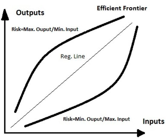 Previously, risk evaluation was based on different parameters like public risk and traffic risk. The public risk was calculated on the basis of the ratio between fatalities and population, and traffic risk was calculated on the basis of registered vehicles. The process of producing a composite value of the risk mean value was undertaken to evaluate the risk, but DEA provides an opportunity to combine multiple variables. This is because DEA is a technique that maintains a mechanism of multiple inputs and multiple outputs for the evaluation of risk []. A conceptual diagram of the DEA model is shown in Figure 2. It is a linear programming technique for measuring the relative performance of entities or units of a similar pattern. Countries are considered to be Decision-Making Units (DMUs) for the application of the DEA model, and the risk level is calculated by applying the road safety outcome and exposure variables.