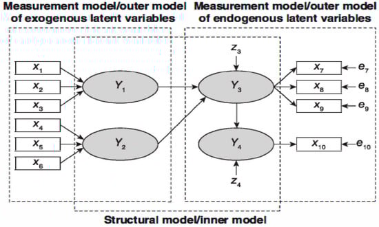 Structural Equation Modelling (SEM) is a technique that can handle a large number of endogenous and exogenous observed variables simultaneously. SEM consists of a set of equations that are specified by direct links between variables []. For road crash data analysis, “SEM is adopted as a latest procedure which can handle large data set and variables. However, in SEM, we can introduce ‘latent variables’ which are the unobserved variables and represent unidimensional concepts in their purest form. Other terms for these are unobserved or unmeasured variables and factors” []. SEM grants the specialist the ability to simultaneously examine two or three relations of reliance and autonomy among latent variables by methods for observed factors, and is thus a standout amongst the most current multivariate techniques utilized in the sciences [,,]. Partial Least Squares (PLS-)SEM is similar to the use of multiple regression analysis. Its main objective is to boost the explained variance in the build setup and to decide the initial classification of the information, principally in view of the qualities of the estimating model [,]. The PLS-SEM is named “Partial Least Squares” on the grounds that the elements are evaluated by methods for a series of least squares, while the expression “Partial” is derived from the use of an iterative estimation system for the parameters in groups (per latent variable), to the detriment of the whole model, at the same time []. In SEM, the deciding of the event, which is not always unambiguous (latent construct), occurs through indicators that fill in as substitutions for the latent variable of interest [,]. In this manner, through the amalgamation of a few things in a scale, the immaterial idea of consideration can be estimated in an indirect way. In the course models, charts are utilized to outwardly show the theories and hypothetical relations among factors. In Figure 3, the inactive builds are spoken to by utilizing circles or ovals (Y1 till Y4), the indicators (observed or occurring factors) are spoken to by the method for rectangles (x1 till x10). The relations among the builds and amongst indicators and develops are represented by arrows. In PLS-SEM, the arrows dependably factor in a solitary heading, speaking to a directional relationship. Arrows pointing in a solitary bearing are respected by a predictive connection and, if there should arise an occurrence of a solid hypothetical establishment, they can be interpreted as causal connections. At last, the error terms (e.g., e7 or e8), reflexively connected to the endogenous construct, portray non-clarified change when the course forms are estimated [].